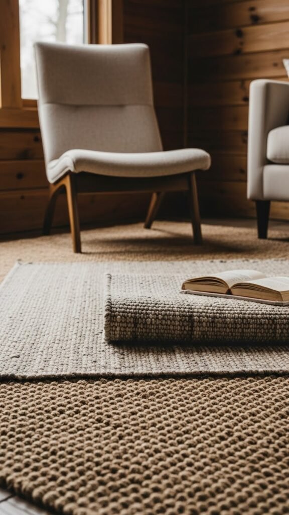A few layered natural-fiber rugs can instantly anchor your room and add tactile warmth underfoot, so start by choosing jute or sisal for a coarse, rustic base and top it with a softer wool or flatweave in a neutral tone; the contrast in pile and weave creates depth without cluttering your modern cabin aesthetic.