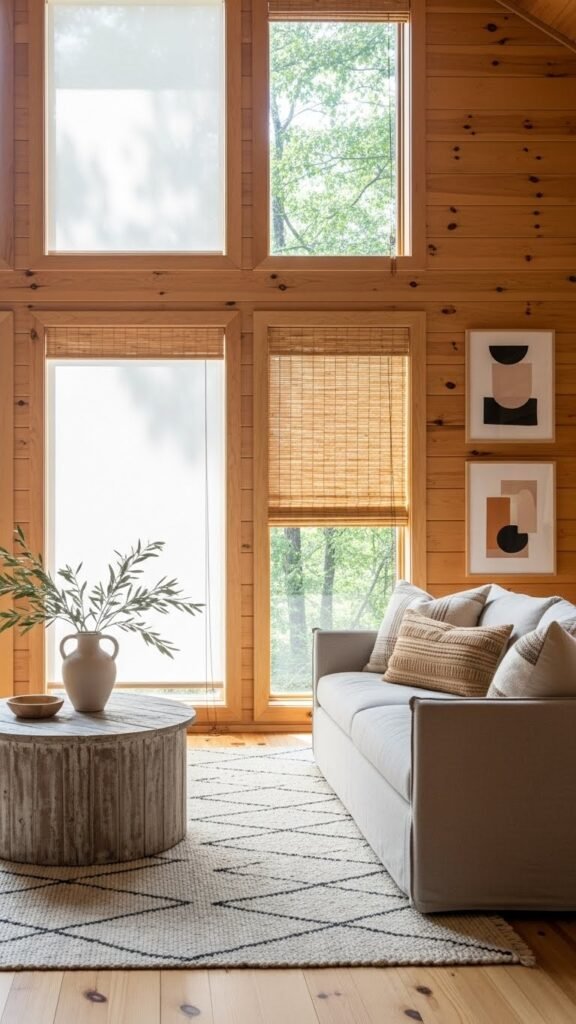 Lighten up your windows by swapping heavy drapes for minimal treatments that boost daylight and show off the cabin’s wood grain and views. Choose sheer solar shades for soft privacy without blocking scenery, or install bamboo roller shades for organic texture and quick, effortless operation.