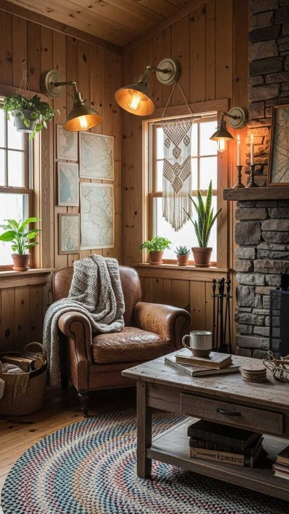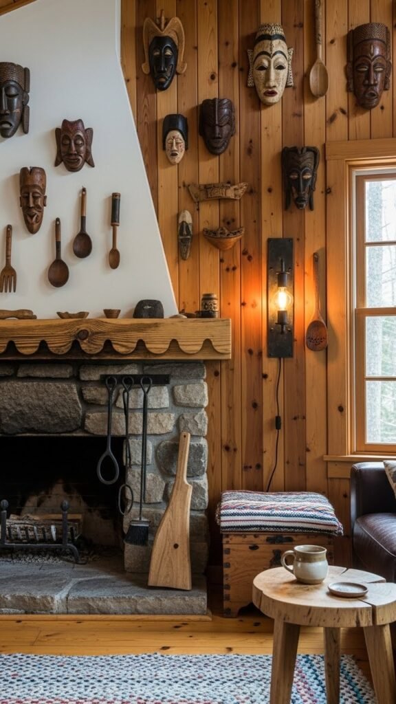 You’ll gravitate to aged brass, sculpted wood, and patina frames; mix them sparingly, let wear show, and curate a free-spirited, authentic cabin vibe.