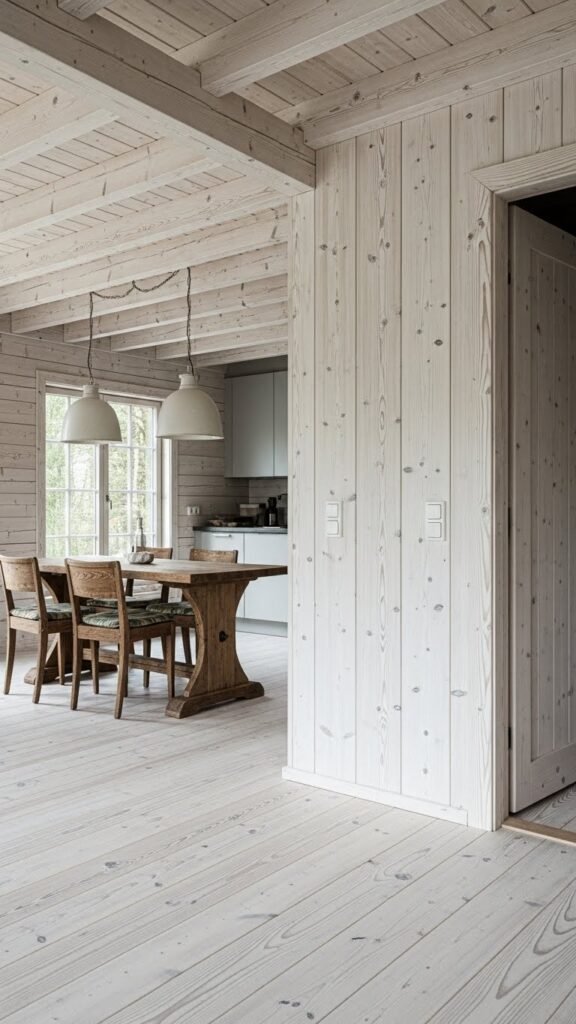 Refresh woodwork with a light stain or whitewash to instantly brighten a cabin interior while keeping its natural grain and character visible. You’ll choose lime wash or a subtle pickling stain to lift oak, pine, or reclaimed boards. Apply thin coats, sand between layers, and wipe back for a lived-in, airy finish.