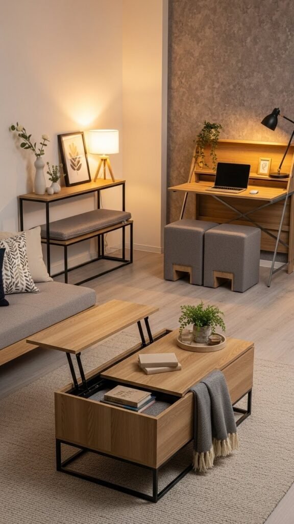 When space is tight, choose pieces that do more than sit pretty: think a narrow bench that tucks under a console and doubles as extra seating, a coffee table with hidden storage and a lift-top for laptop work, or a daybed that converts into guest sleeping.