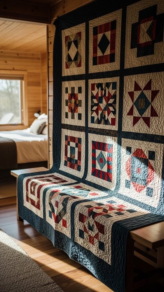 Bring in a patchwork quilt or woven wall hanging to anchor a cabin wall and instantly layer in texture, color, and meaning.