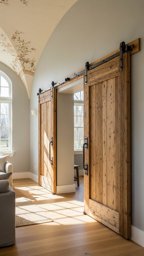 After painting the ceiling to open the room, swapping out heavy swinging doors for rustic sliding barn doors keeps that airy, curated vibe while adding tactile warmth. You’ll choose reclaimed hardware for charm, pick reclaimed wood or salvaged planks, and plan precise track placement so doors glide smoothly.