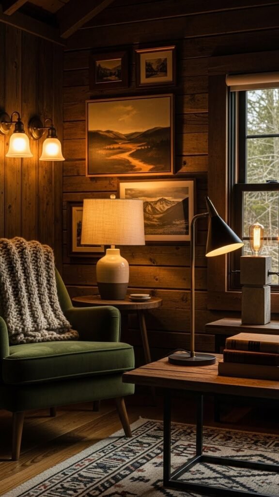 A few well-placed sconces and a handful of table lamps can turn a dark corner into the room’s most inviting spot, giving you control over mood, task, and texture. You’ll experiment with sconce placement to highlight art or a reading nook, while lamp layering mixes warm bulbs, varied heights, and matte or brass finishes so your cabin glows on your terms.