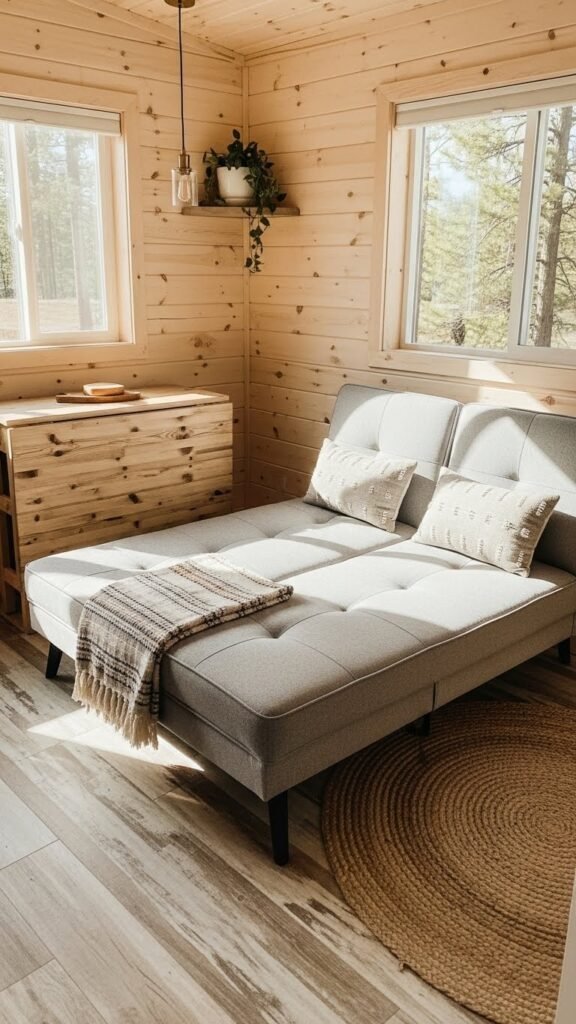 Make the most of tight cabin space by installing a fold-out dining table or a sleeper couch that tucks away when you’re not using it. Choose a murphy table with weathered pine and brass hardware, or a sleek convertible loveseat that doubles as a bed. You’ll gain function without clutter, embracing modern rustic trends while keeping design light, mobile, and liberating.