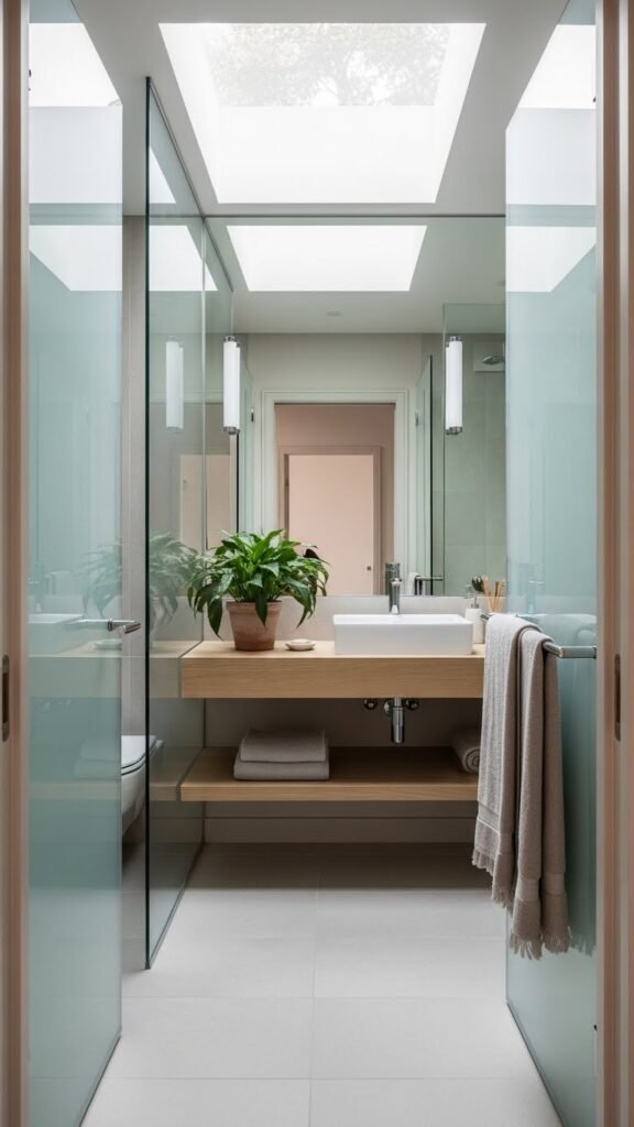 If you’ve just enclosed a compact bathroom with frosted glass and a skylight, carry that same light-first thinking into the rest of your small rooms by using mirrors and pale paint to amplify space and airiness.