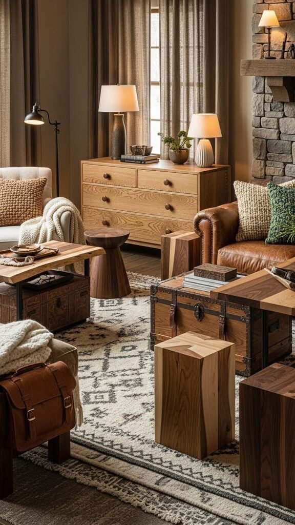 Embrace mixed grains across tables and stools, then add layered textures in rugs, linen curtains, and leather accents so you feel free, grounded, and effortlessly stylish.