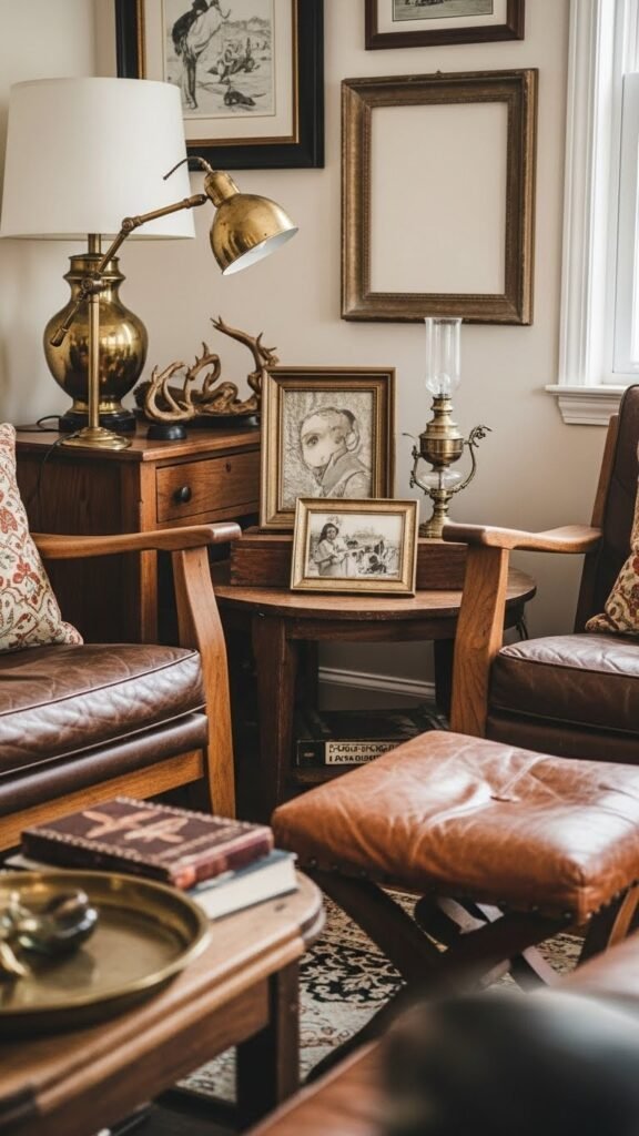 Start hunting flea markets and estate sales with intent: vintage pieces bring patina and stories that new furniture can’t replicate, and a single brass lamp or worn leather footstool will quickly make the room feel seasoned and lived-in.