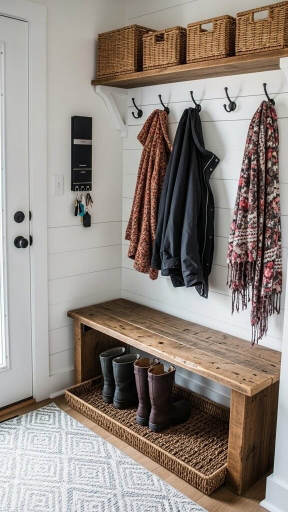 You’ll add a reclaimed bench, woven boot tray for drainage, wall hooks, a slim key organizer, and baskets for scarves—functional, freeing, and quietly stylish for any season.
