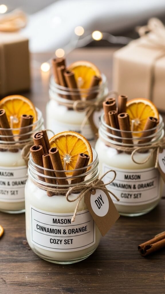 Bring together rustic charm and holiday spice with a Mason Jar Cinnamon & Orange Cozy Set that feels handmade but totally gift-shop worthy. You’ll craft soy candles in mason jars, add cinnamon stick clusters, and top lids with dried orange slices as a citrus garnish. Finish with minimalist DIY labels and twine. It’s portable, personal, and perfect for gifting to free-spirited friends.