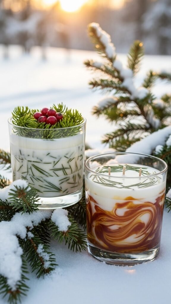 After you’ve mastered the warm spice of cinnamon and orange, shift toward evergreen freshness with a Winter Woods Fir and Pine Pair that feels like a brisk walk through snow-dusted evergreens. You’ll craft two minimalist candles: one highlighting bright fir top notes, the other deep pine resins. Aim for clean vessels, layered wicks, an evergreen aroma and subtle needle texture ambiance for liberated, modern gifting.