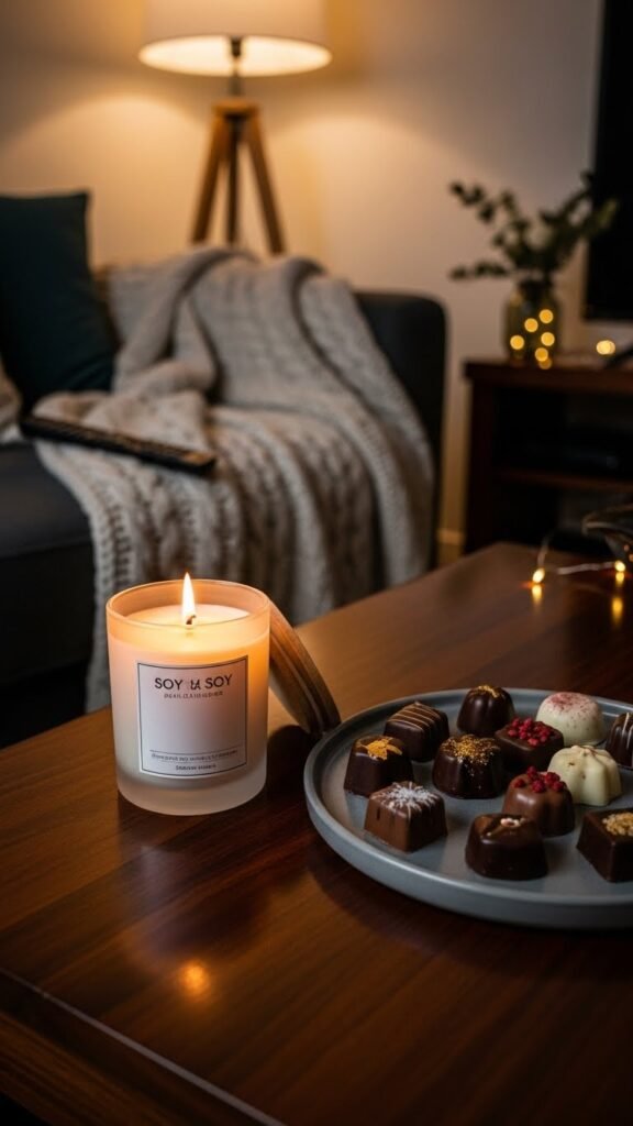 You’ll pick bold dark for smoky woods or milk for vanilla amber, arrange chocolates by intensity, cue a soft playlist, and start a relaxed movie night.