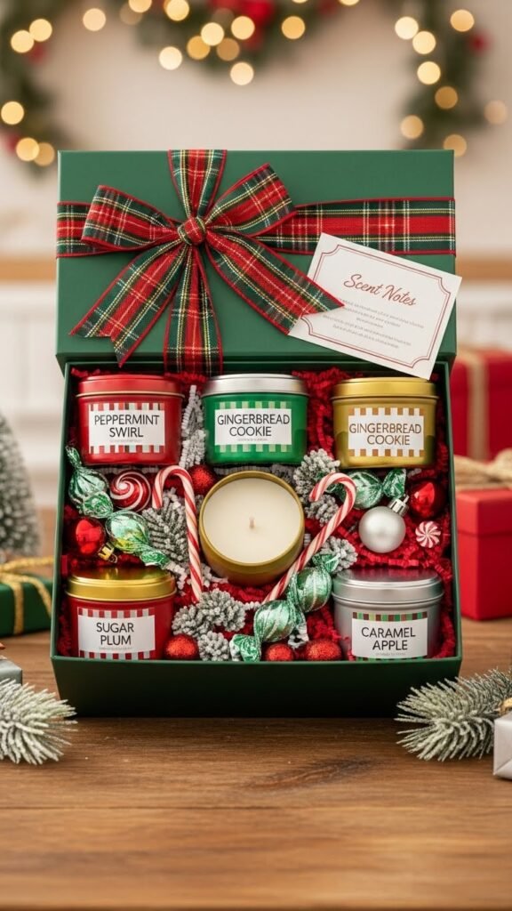 Bring a playful twist to gifting by arranging a Festive Candle Candy Box that looks as sweet as it smells. You’ll select candy scented votives in festive tins, nestle them with tiny treats, and add ribbon accents for pop.