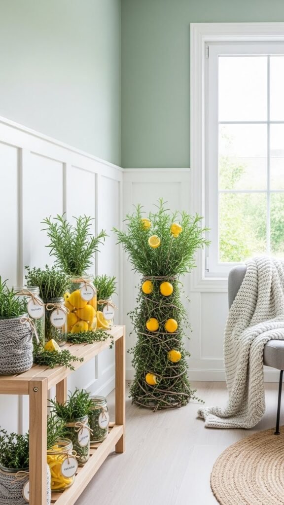 You’ll layer rosemary, thyme, and lemon peel around jars, tie sprigs to labels, and suggest botanical centerpieces or citrus infused wreaths as styling notes—clean, modern, and effortlessly liberating.