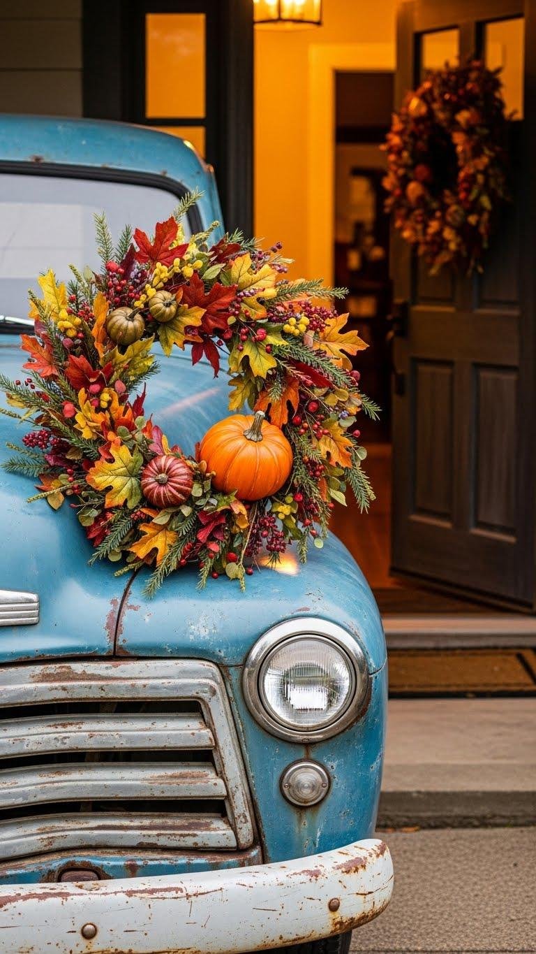 After the vintage truck sets a nostalgic tone on your doorstep, shift focus to a hand-painted wreath centerpiece that brings color and personality to your entry.