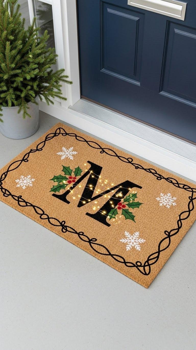 Make a statement with a Merry Monogram doormat by personalizing it with your initial and a festive twist—think holly, snowflakes, or a tiny string of lights woven into the letterform. You’ll craft a bold initial ornament focal point, add a subtle monogram garland border, and choose durable paint. It’s minimalist, modern, and lets your front door reflect your independent, stylish vibe.