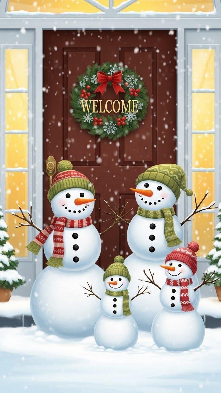 While a Snowman Family adds playful charm, you can shift to a more textured, farmhouse look by layering rustic burlap under the doormat and finishing with a big burlap bow at the corner.