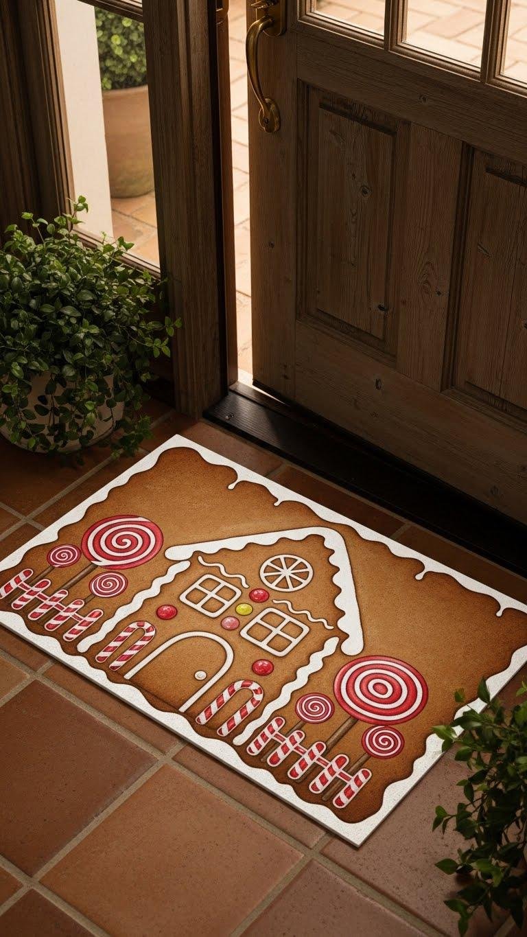 If you want a warm, whimsical entryway, paint a Gingerbread House Motif on your doormat to capture that cozy, festive vibe; use simple shapes, candy-inspired accents, and earthy tones so the design reads clearly from the path.