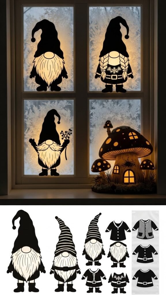 You’ve mastered delicate snowflakes, so now bring a cozy, whimsical touch with gnome window cutouts that feel warm against frosty panes. Trace simple silhouettes: tall hats, beards, tiny boots. Add a gnome wardrobe strip of detachable outfits for playful swaps. Frame a mushroom home scene beside them for depth. Cut crisp edges, backlight with soft LED strands, and let your street glow free.