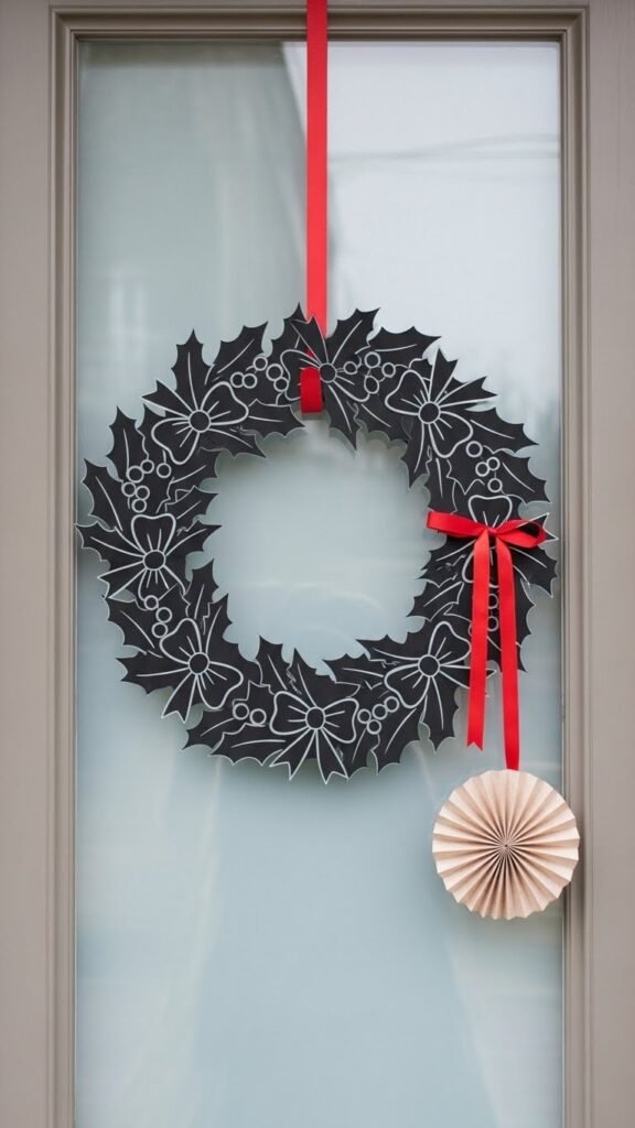 Arrange a simple wreath silhouette from matte black paper to transform your window into a seasonal focal point: trace a neat circle, add evenly spaced holly leaves or bow shapes, and trim for crisp, balanced edges so the design reads clearly against frosted glass.