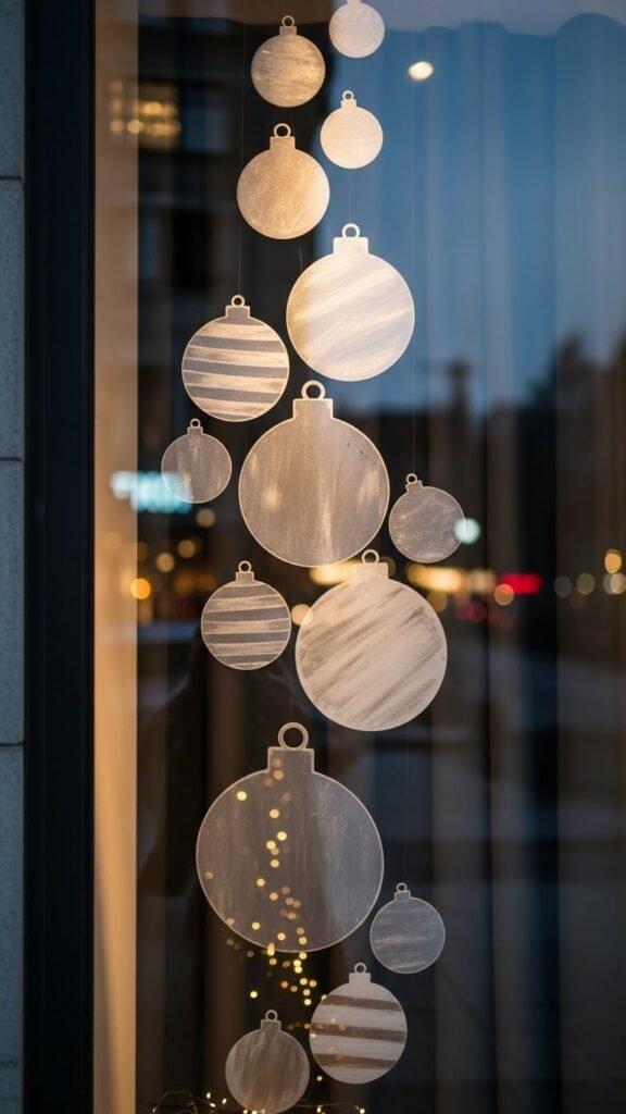 After crafting your wreath silhouette, shift attention to layered bauble window silhouettes to add depth and playful movement across the glass.