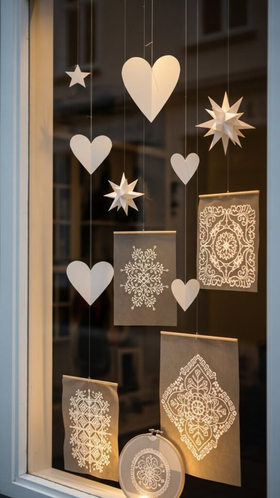 Cut paper hearts and stars using Scandinavian motifs as guides, hang asymmetrically for airy freedom, and trace minimalist embroidery patterns onto vellum for soft glow.