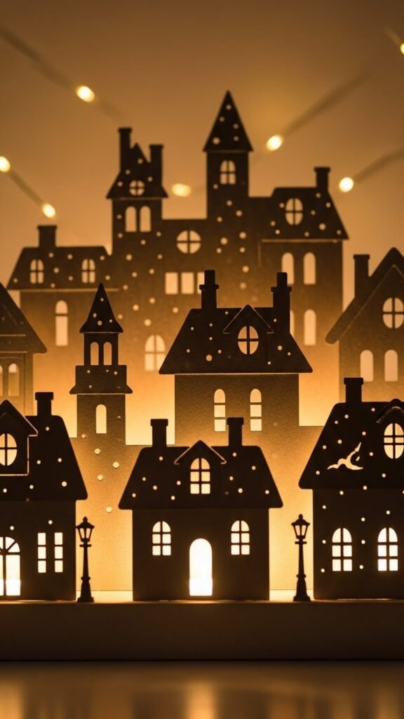 Imagine tracing a sleepy little town in silhouette across your window, rooftops and steeples cut from black paper and layered to catch the glow of indoor lights; you’ll arrange varying heights and depths to create a sense of distance, tuck in tiny paper chimneys and lamp posts for character, and leave gaps for soft light to spill through as if snow were falling.