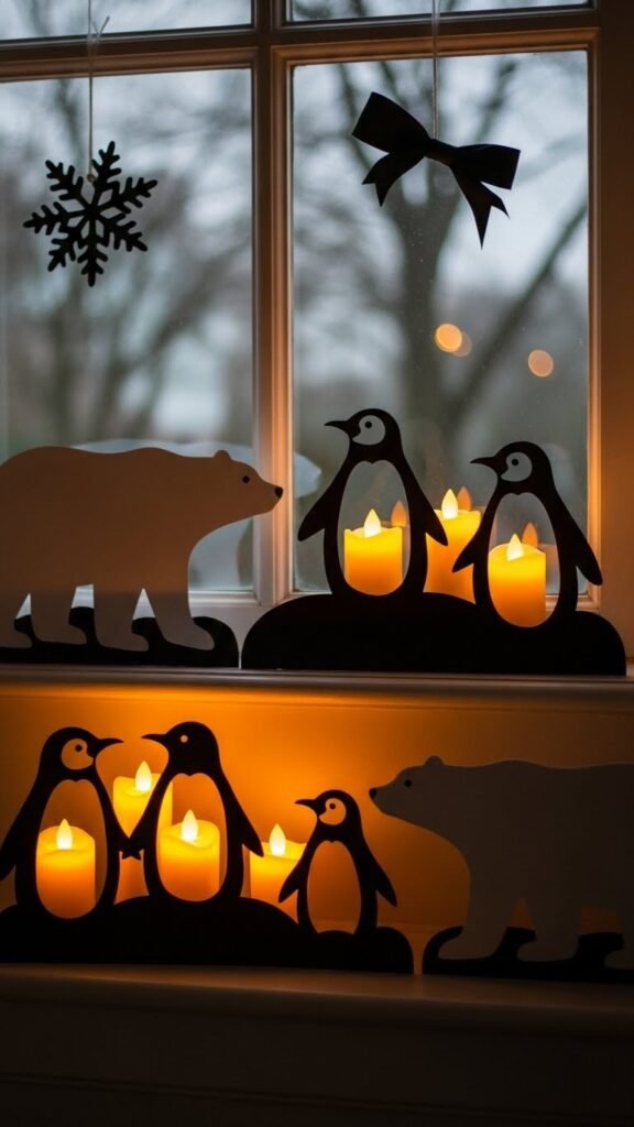 If you loved the playful penguins and polar bears, you’ll like how a row of candlelit silhouettes adds warm, flickering charm to your window scene.