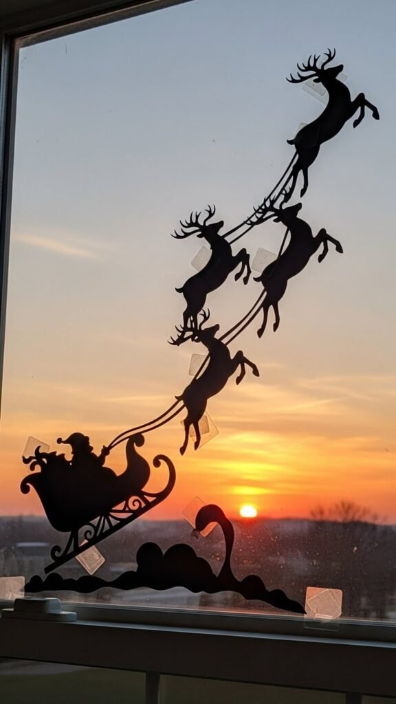 Cut bold shapes from black cardstock, vary sizes, and arrange on sheer fabric or frosted film. Use removable adhesive, add tiny paper scarves, and position a warm LED behind the scene. You’ll create a joyful, free-spirited winter tableau.