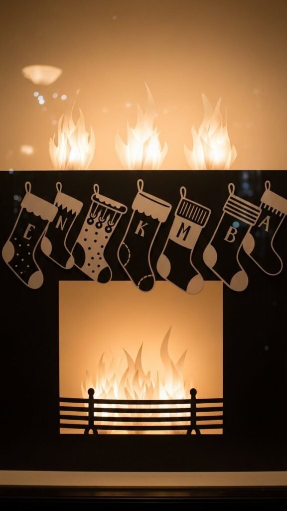 Position flames behind translucent paper to suggest hearth textures, then vary stocking shapes for rhythm.