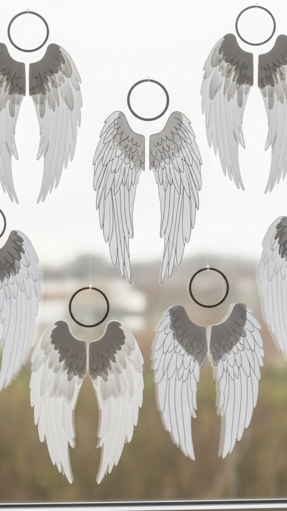 Create graceful angel wing and halo silhouettes by tracing wing shapes onto translucent vellum or thin white cardstock and cutting them out with crisp, clean lines; pair each wing with a simple circular halo cut from metallic paper to catch the light. You’ll mount them to windows so they glow softly lit, show feather texture, and float freely, inviting passerby wonder with minimalist, spirited charm.