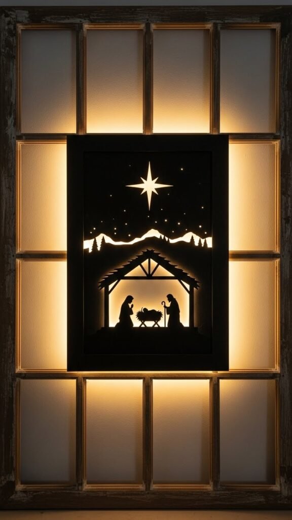If you want a timeless, rustic focal point for your window, cut a dark panel—black foam board or painted plywood—into a simple skyline and paint or glue on crisp silhouettes of the manger, star, and figures; hang it inside the window so backlighting or a string of warm LEDs casts the scene in sharp relief.