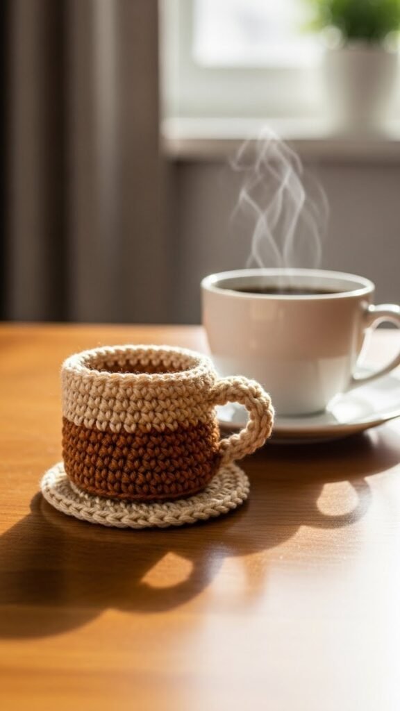 You’ll craft a miniature mug-shaped coaster with an ergonomic handle, choosing durable yarn and simple stitches.