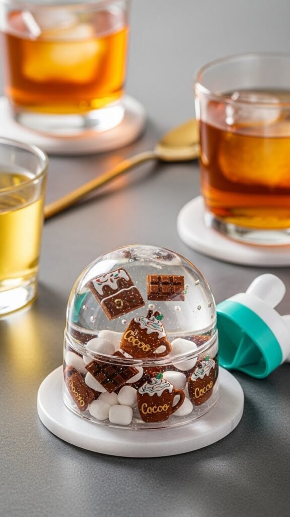 Bring a playful, tactile element to your table with a resin hot cocoa shaker coaster that mixes clear epoxy, tiny cocoa-themed charms, and a sprinkle of faux marshmallows in a spill-proof dome; you’ll get both eye-catching sparkle and a functional surface that keeps drinks steady.