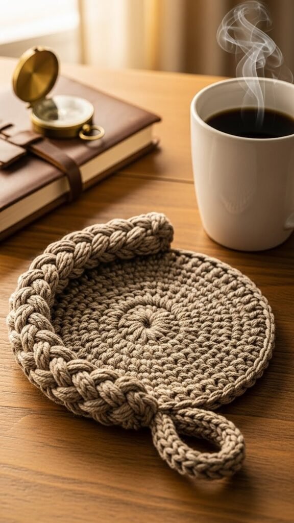 This simple project gives you a durable, trend-aware coaster with pronounced braided texture. It’s practical, freeing, and quick—perfect for gifting or keeping your cozy space mess-free.