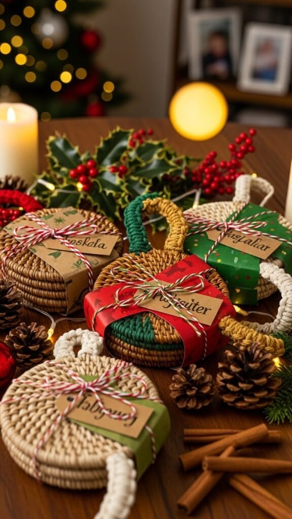 If you loved the portability of the Braided Handle Mug Coaster, you’ll appreciate how the Holiday Gift-Tagged Coaster Set pairs handmade charm with ready-to-wrap presentation.