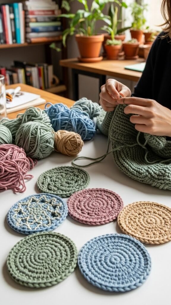 Embracing recycled yarn lets you make coasters that feel good to hold and good for the planet, using scraps and thrifted fibers to create sturdy, stylish rounds.