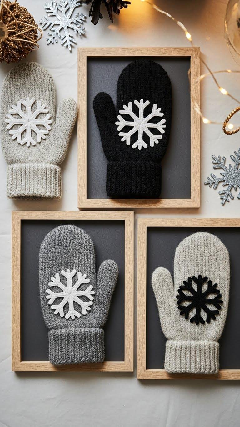 Crafting snowflake-appliqué framed mittens instantly lifts a room with wintery charm—picture soft wool mittens stitched with crisp, graphic snowflakes and arranged like tiny artworks inside simple shadow frames.