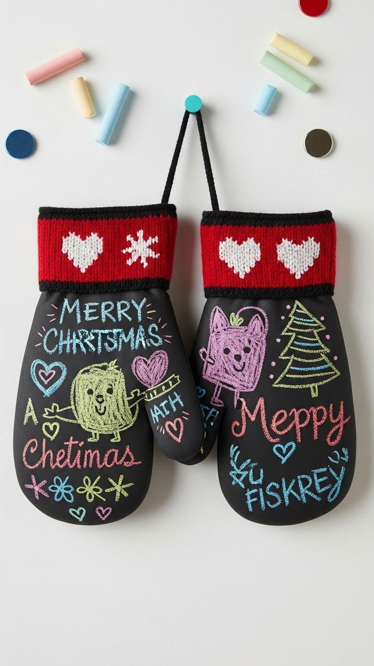 Turn a pair of mittens into a tiny message board by painting them with chalkboard paint—you’ll get a playful, functional piece of wall art that invites notes, doodles, and seasonal greetings. You’ll hang them with hidden magnets for Magnetic reminders, swap chalk artography designs whenever you want, and personalize colors and shapes. It’s bold, portable, and frees your space to change mood on a whim.