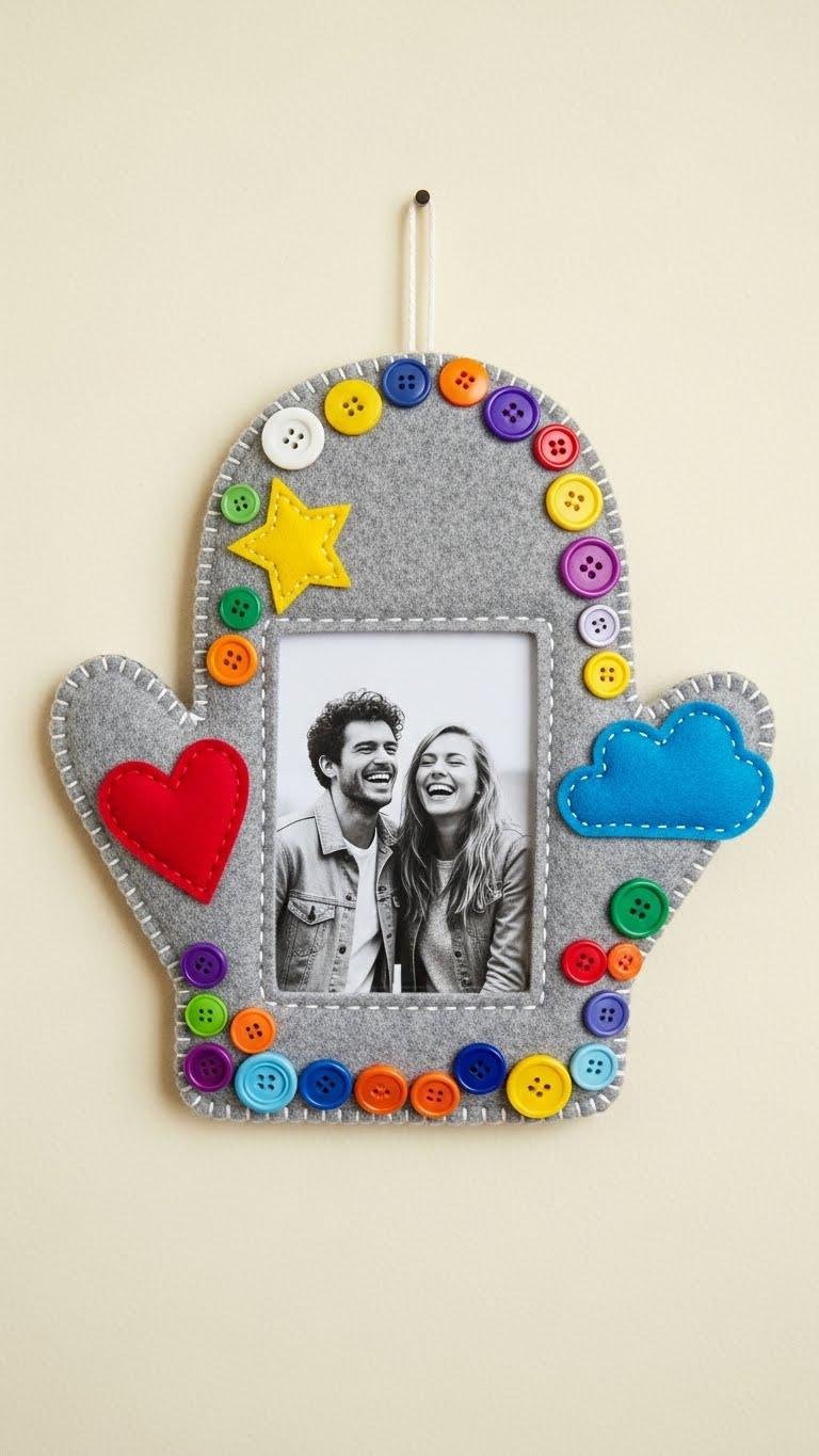 If you loved the clean lines of a reclaimed wood mitten, you’ll appreciate how a Button-Embellished Felt Mitten Frame brings playful texture and color into the same cozy corner.
