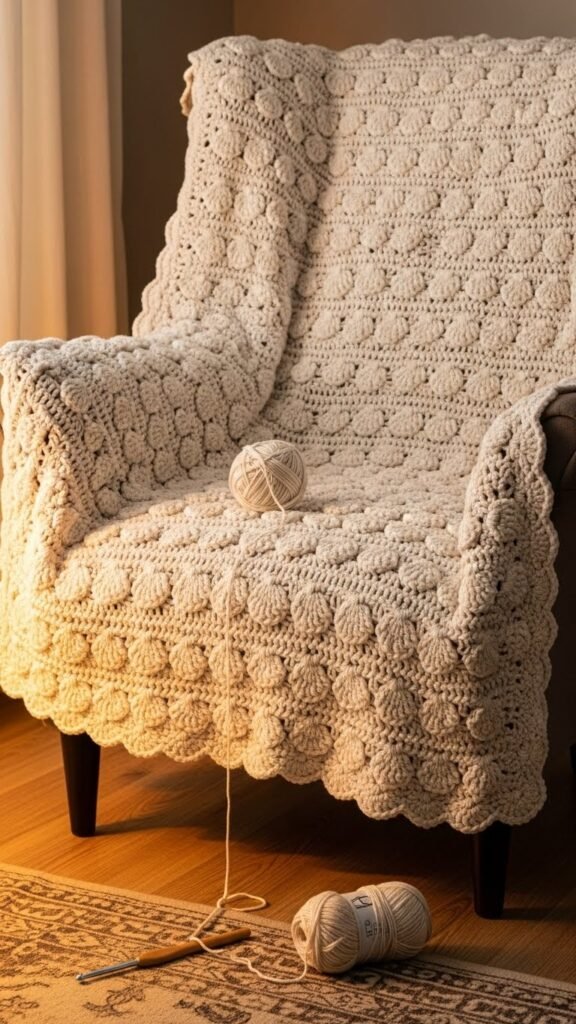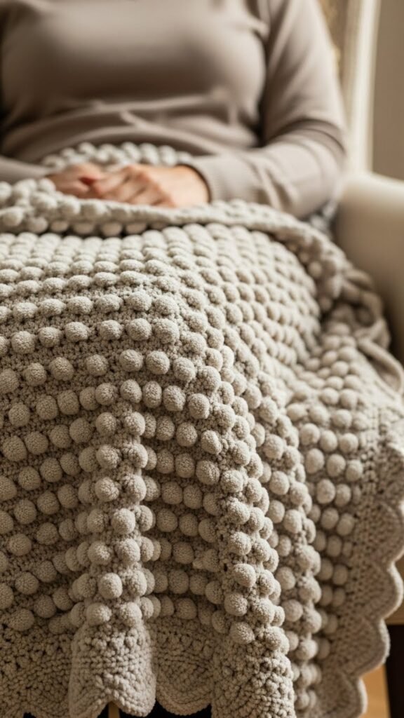 When you settle into a chair with this Textured Bubble Scallop Throw draped over your knees, you’ll notice how the raised bubble clusters catch the light and invite touch; the scalloped border frames the whole piece like a soft, handmade hug.