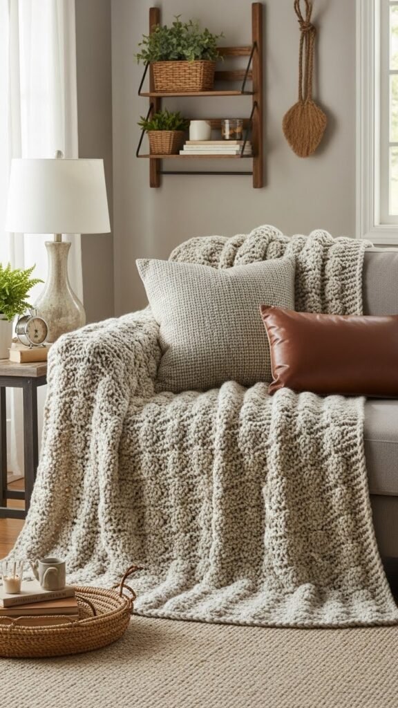 A rustic natural-fiber scalloped lapghan wraps you in earthy texture and gentle curves, and you’ll love how the simple stitchwork lets the material’s character shine; choose wool, alpaca, or a linen-wool blend for warmth and a soft halo, then work the scallop border in a contrasting neutral to highlight each curve.
