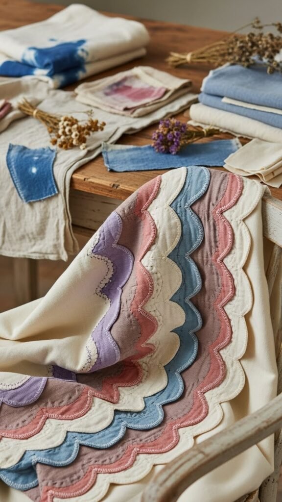 You’ll rescue scraps, echo antique linens, and use cottage dyeing to soften hues. Pin scallops evenly, stitch with running or blanket stitch, press gently, and let irregularities read as freedom — a cozy, intentional finish.