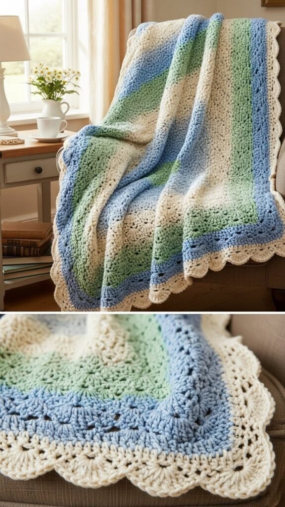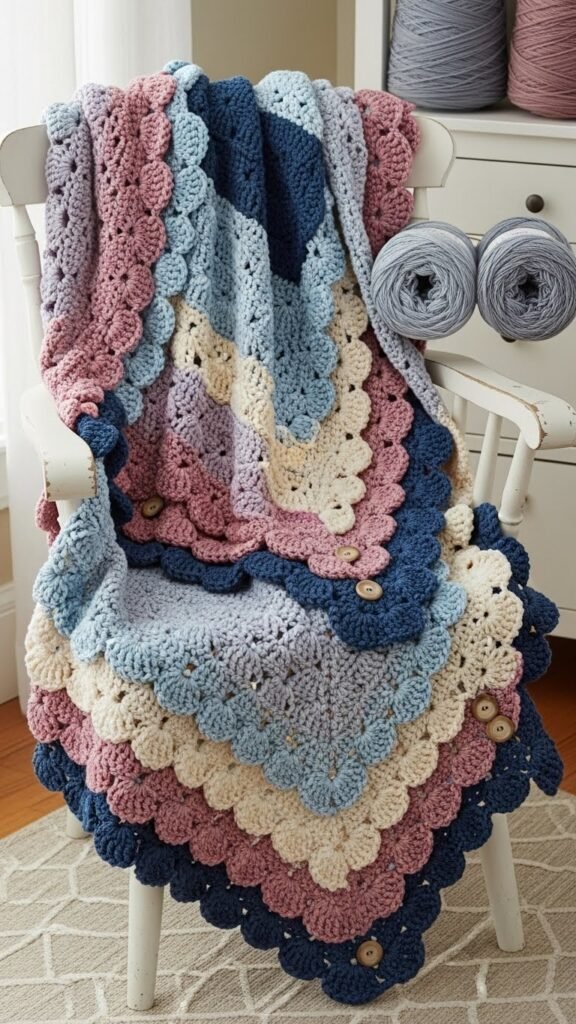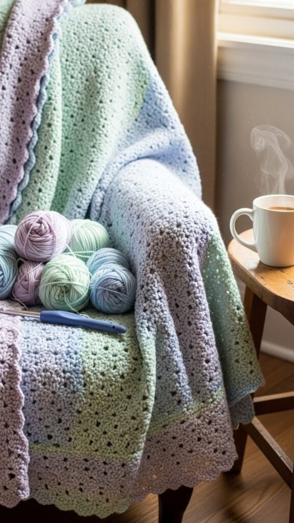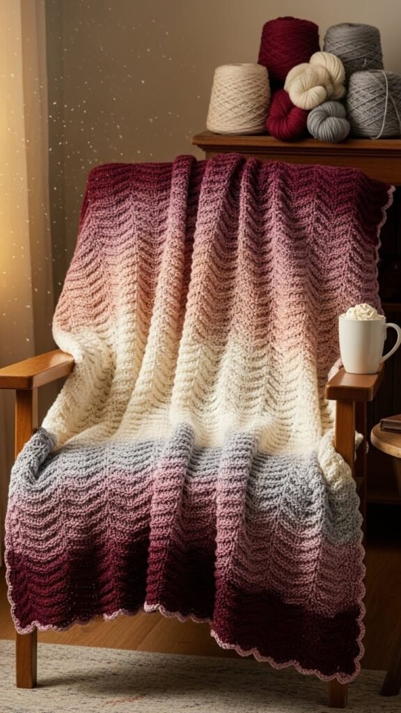 After you’ve stitched that cottage scallop border, lean into a slightly bolder rhythm with an ombre treble shell winter blanket that layers color and texture without fuss.