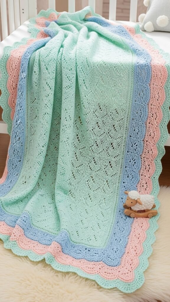 Often you’ll reach for soft pastels and tiny stitches when making a delicate picot-scallop baby blanket, because that lightness helps the scallops read small and sweet without weighing the fabric down.