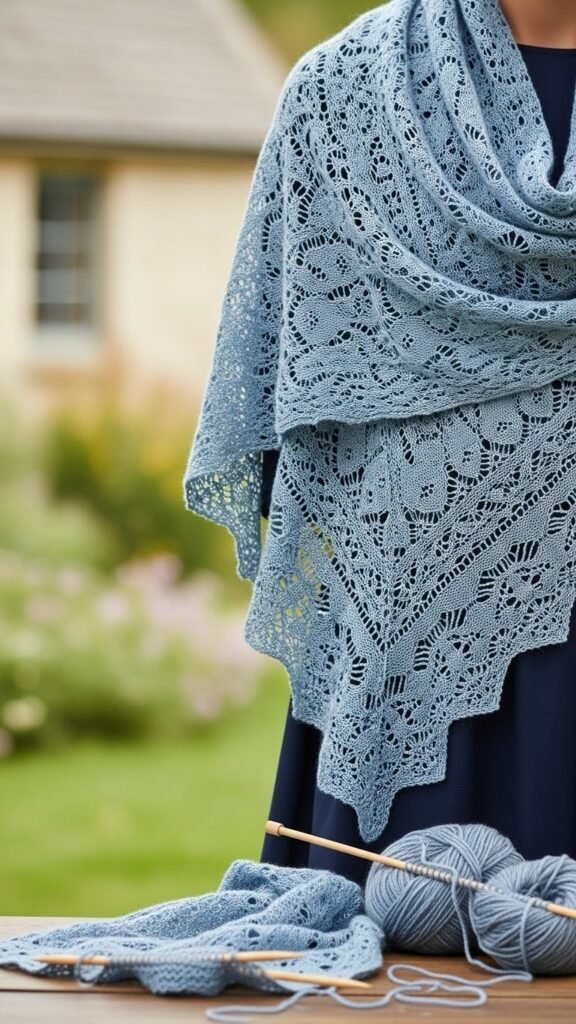 You’ll drape soft yarn with open lace motifs and follow a measured scallop repeat, shaping rows to flow around shoulders. Work on loose needles, block gently, and wear freely for cottage strolls.