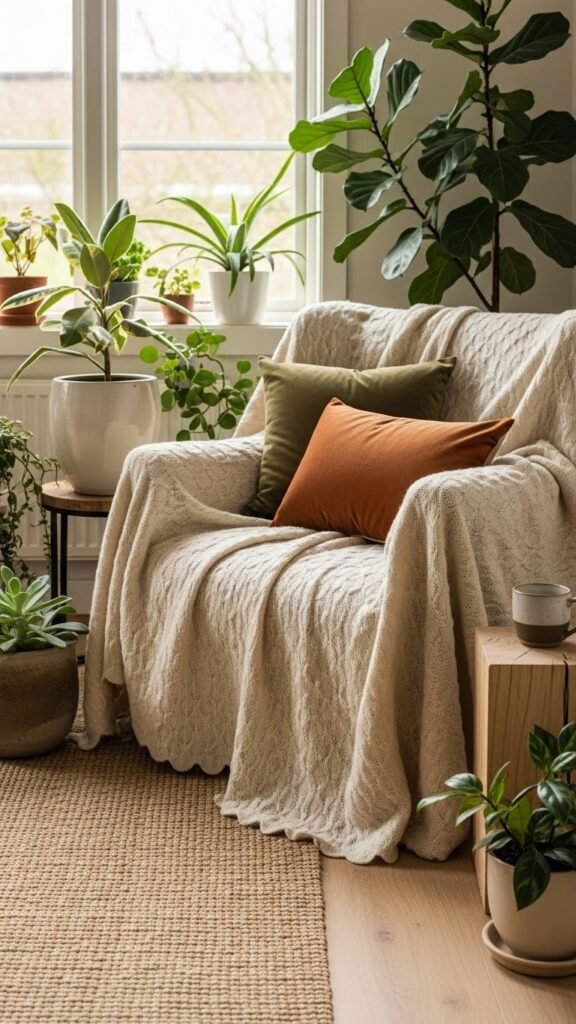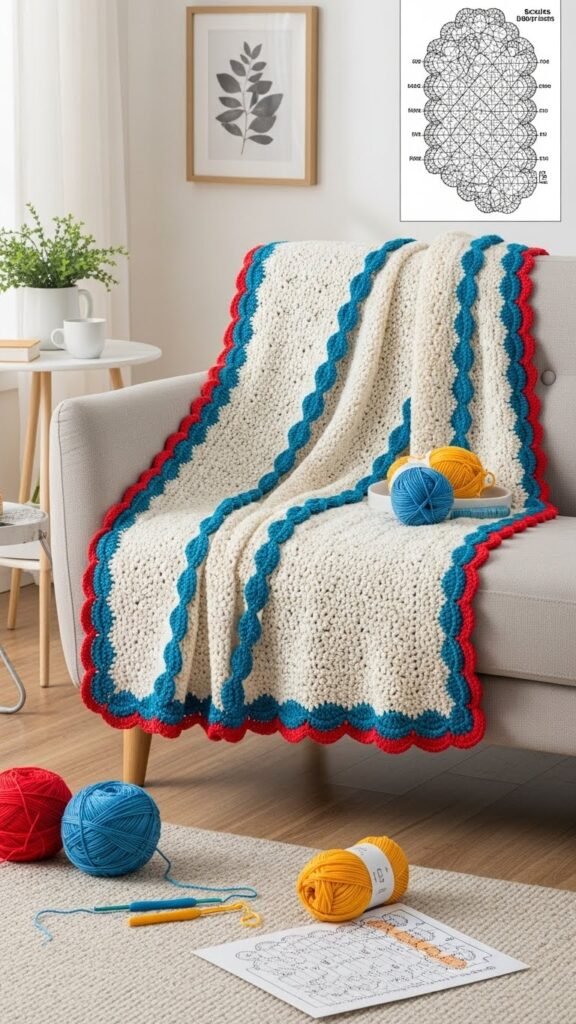 You’ll love how scalloped edges soften any blanket and give your space instant cottage warmth. Picture layered shell stitches, soft merino or washable acrylic, and neat picot trims in muted pastels or rich wool tones. I’ll share practical tips on yarn choices, easy shaping, and quick no-sew options so you can pick a project that fits your time and skill — and one charming pattern might just become your next favorite.