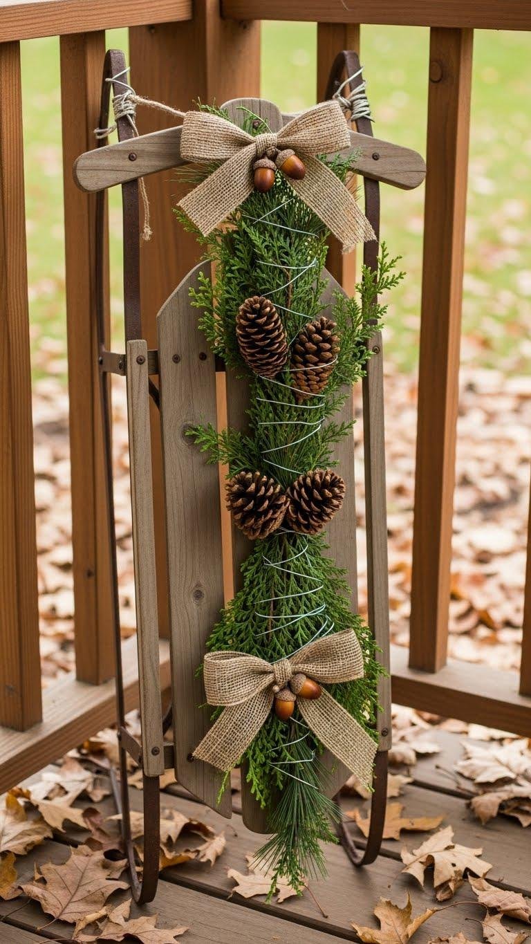 When you want a cozy, natural look, a rustic pinecone and greenery sled accent is quick to assemble and looks great leaning against a porch or mantle. You’ll wire greenery to the sled, tuck in pinecones, add pine scented sachets for depth, and finish with acorn embellished bows. Work briskly, trust your taste, and let the piece feel free and effortless.