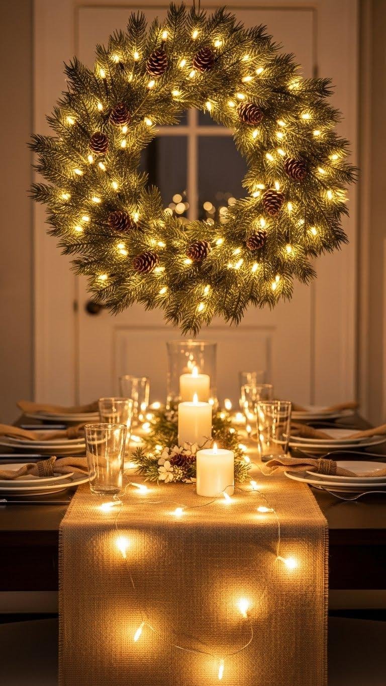 With a few simple supplies and an eye for balance, you can create a matching twinkle light wreath and table runner that instantly lifts your entryway or dining table.