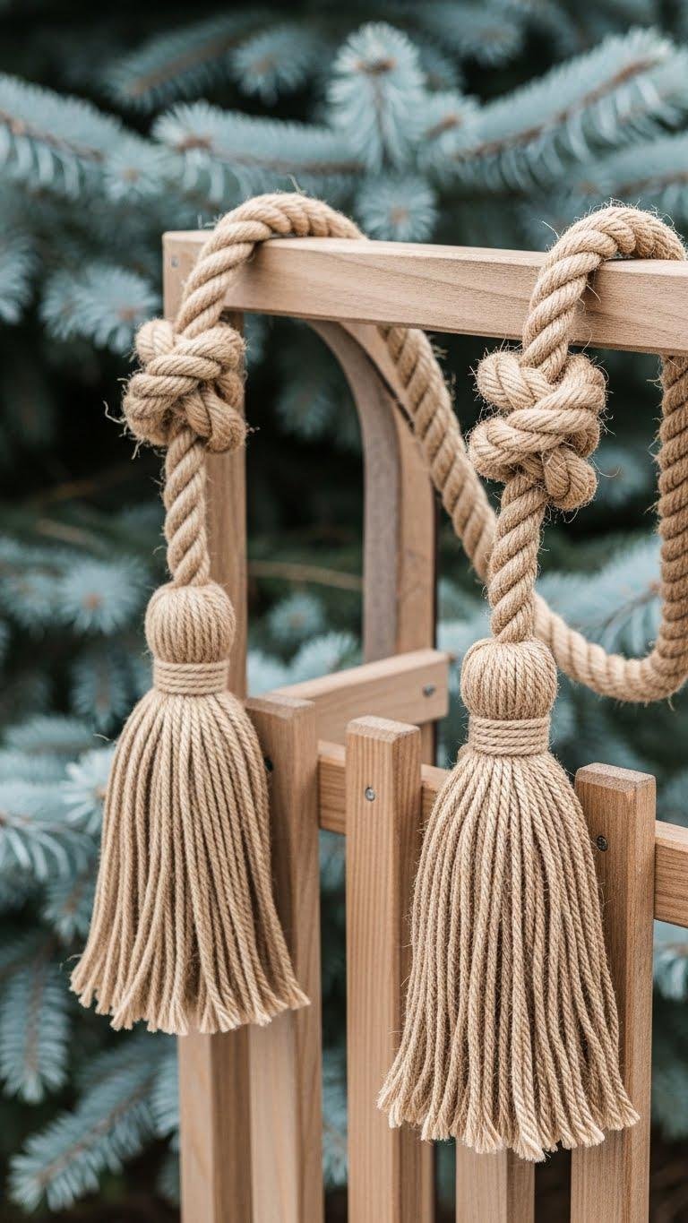Run a length of natural jute rope through the sled’s existing handle slots to create a rustic, comfortable grip that complements your frosted pine spray. Tie secure nautical knots so the rope won’t slip, then fashion tassels at each end for flair.